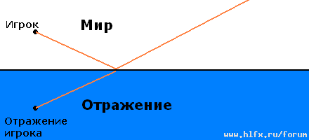 Как я понял openGLoвское зеркало в халфе имеет камеру в центе которая проеирует каждый кадр на текстуру ... Так вот у меня вопрос : Почему оно не отражает отраженный луч от гауса ( на схеме отмечен оранжевой линией ) ? И подобных пушек ? Как это фиксить ? Внизу прилагается подобная схема этого странного глюка ...
