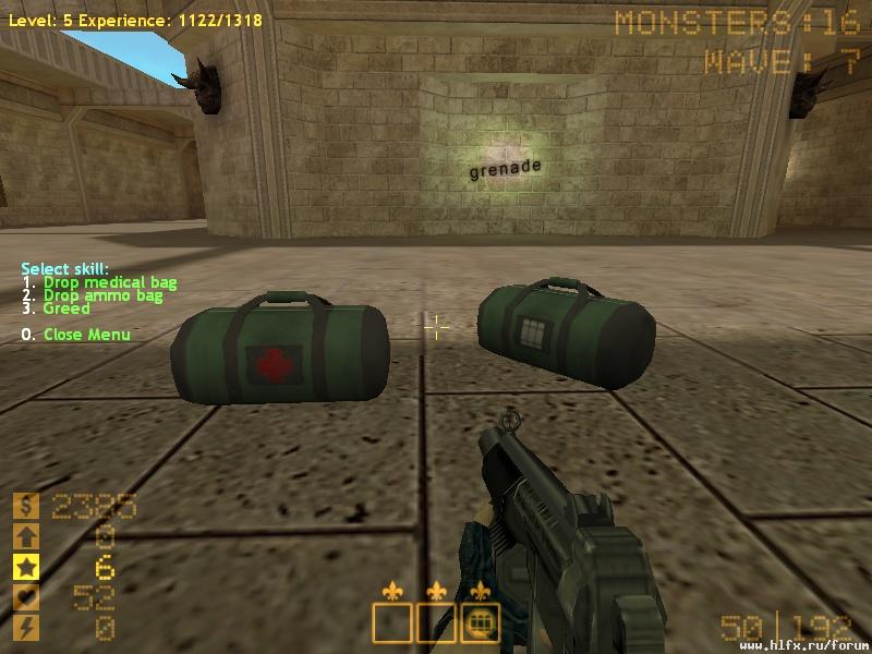Есть простенький инвентарь, пока что текстовый. Инвентарь банально на три слота: шлем, броня и побрекушка. Теперь на ХАДе отображается пояс, в котором можно таскать пару аптечек и бутылок маны. Кстати о мане, да, теперь есть мана и расходуется она тремя скиллами одного из трех классов защитника. Скиллы будут открываться с уровнем, у каждого класса есть свой ультракрутой скилл. Так же в статах теперь можно качать мэджик, помоему это самый мощный стат, он влияет на расход маны, время скиллов и их силу. Появилась такая мелочь как критикал хит, шанс 1%, но довольно серьезно увеличивается при прокачке стрельбы. Некоторым людям я уже говорил о классах, но на тот момент была придумана банальная муть мол "лишь бы было". Планировались хилер, верующий и запасливый. Однако хилер был имба, но и одновременно очень бредовым классом. На тот момент только запасливый был наилучшим, хоть и не был реализован. Верующий был очень слабым. Расскажу вкратце, что это такие за верующие, запасливые и, заменивший хилера, мчащийся. О скиллах пока молчу.