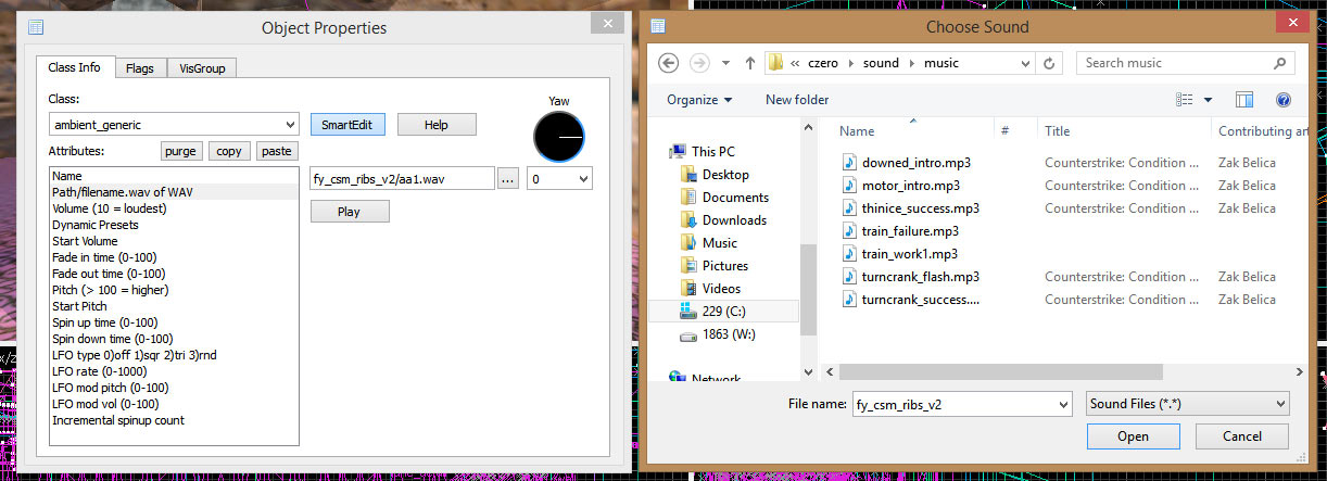 Есть вот у голдсурсовых игр энтить ambient_generic в FGD. И там можно выбирать путь до звукового файла, через редактор. Но отображаются там файлы только с расширением .wav, а нужно еще и .mp3, по крайней мере для ксаша. А то очень неудобно.