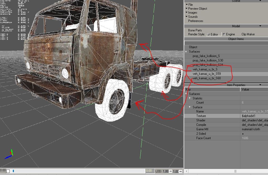 Я не знаю, откуда ДМ выдирал модель, но оригинальный камаз из зп (а туда он перешел из тч) при компиляции уровня будет разбит по материалам.