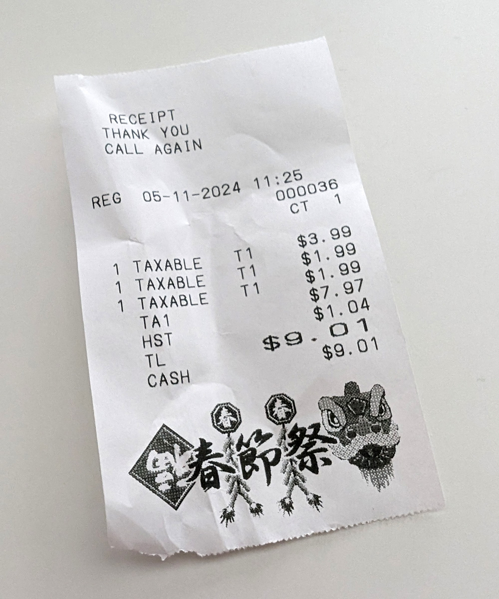 А вот так выглядит обычный чек из небольшого магазина в центре Торонто. И нет, этот магазин не в чайнатауне.