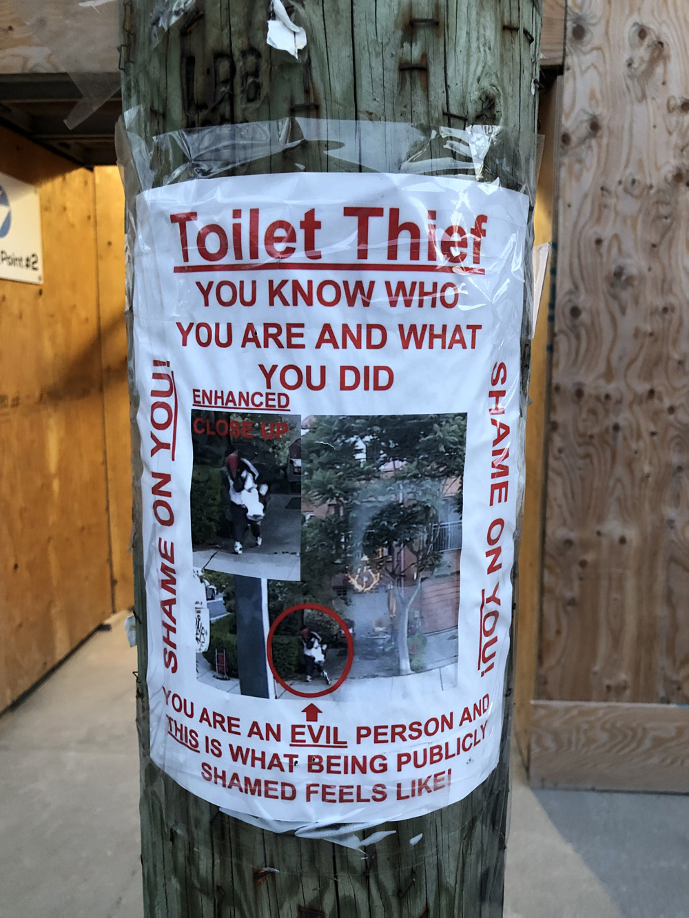 Тем временем, в Торонто свирепствуют воры, которые крадут у добропорядочных граждан унитазы. Полиция тут, похоже, бессильна. Но есть (непопулярное) мнение, что это делают отпускники из США, которые ни разу в жизни не видели настоящих унитазов, вот и пытаются поживиться ими в Канаде (но это не точно). Жертвам такого бесчеловечного преступления остаётся только развешивать плакаты, пытаясь взывать к совести негодяев.