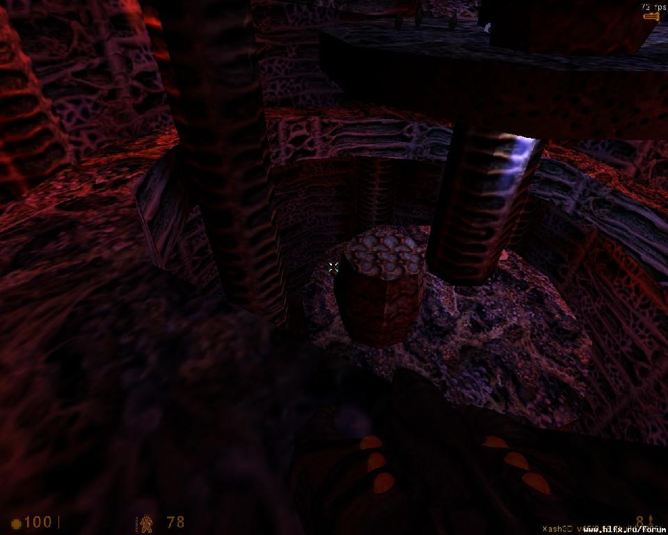 Однако по-прежнему игра виснет при стрельбе мухами (баг 23). Один раз даже зависла при стрельбе ракетой по Нихилансу. Для пробы предлагаю карту c4a1e. Особенно стабильно висла игра при стрельбе мухами в малой шахте карты (куда можно попасть через два прохода в стене в середине главной шахты). К примеру место на скрине (нижняя площадка малой шахты, проходим туда через левый проход). При попытке пострелять мухами по шокерам виснет ну очень стабильно, не успеваю даже шокера убить. Да и вообще попробуйте пострелять где угодно мухами в течение минуты-двух без остановки. У меня гарантированно зависает раньше или позже. Модель "мухи", как я уже упомянул, я сменил на дефолтную, так что дело точно не в ней.