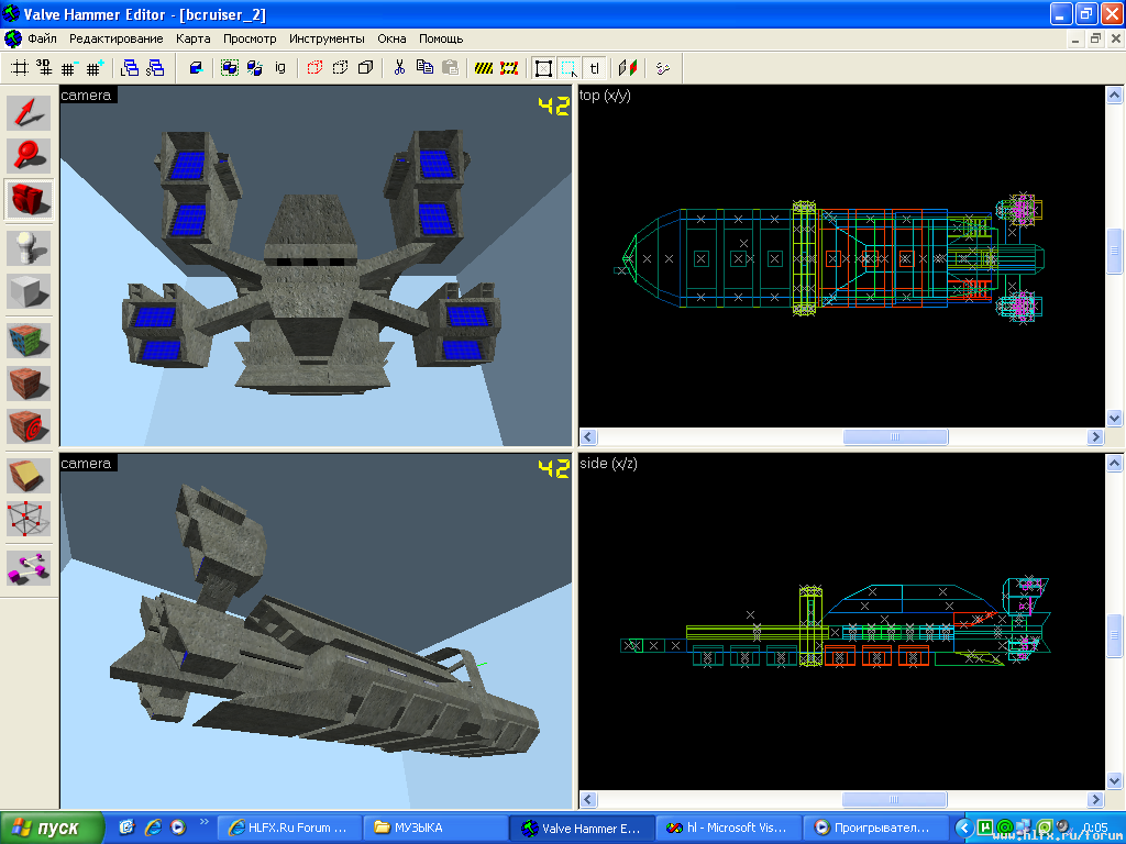 Внешний дизайн корабля ужасный. Кубоформы откровенно жгут. Найди нормальные рефенсы и намодель по ним. Лучше всего подобные вещи делать не в хаммере, редактор под это не предназначен. Возьми нормальный пакет моделирования - макс или маю.