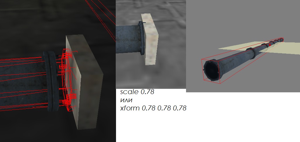 Прикрепил скриншот - что в игре, в хаммере, и скриншот модели. В хаммере ставил scale 0.78 или xform 0.78 0.78 0.78.