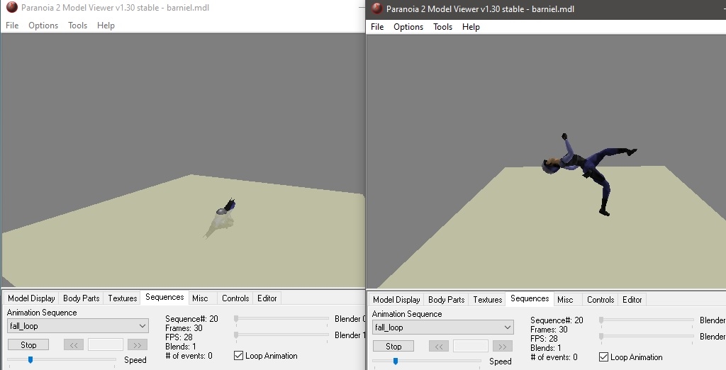 Вот такой баг с моделью после компиляции. А точнее - с одной из анимаций. Модель декомпильнул, потом скомпилил. Слева - параноевский компилятор, справа какая-то древность (2004 года файл). Некоторые анимации просто расплющились, остальные нормально. qc и smd файл абсолютно идентичные.