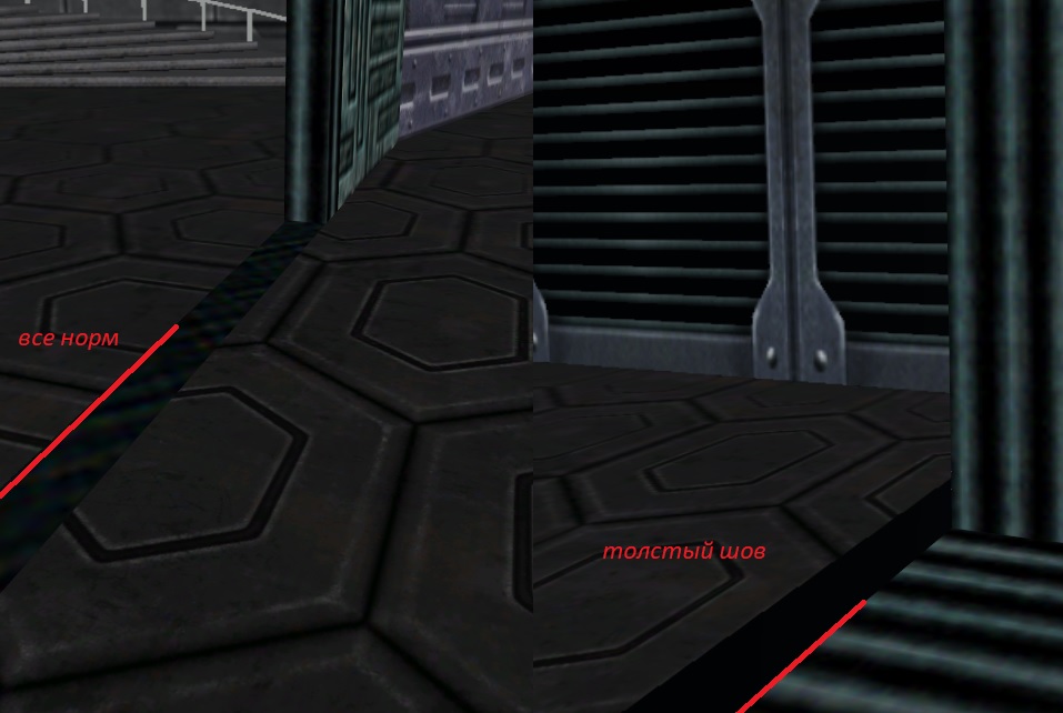 Красной линией обозначена граница портала, переступив эту линию игрок переходит на другую сторону. Но, один проход выглядит визуально бесшовным, а другой имеет вот такой видимый шов, что портит визуальность. При всем этом сам механизм перехода бесшовный, то есть если смотреть прямо когда переходишь (значит настроил все правильно).