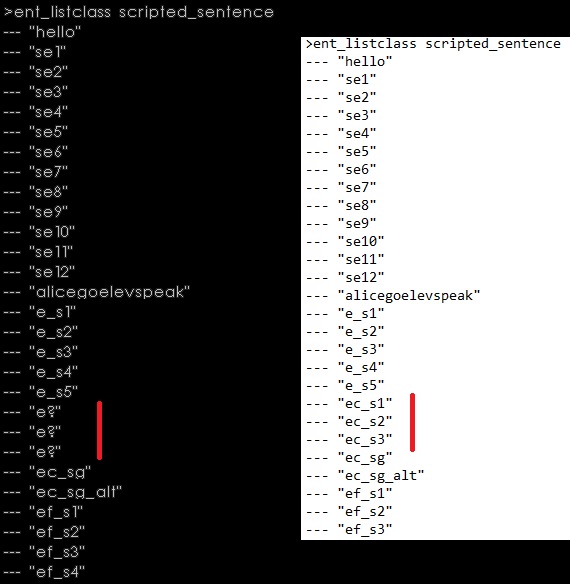 Вот даже так. У меня не воспроизводились сентенсы в игре, парочка. Вывел все энтити в консоль и очень удивился. И самое странное, что в ксашевском логе отображается нормально, а в консоли нет. И как раз эти же энтити и не запускаются - пишет нет такой энтити.