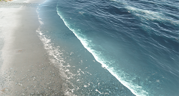 Большинство не заморачиваются и делают меш с вертекспаинтом аккуратно по берегу. Это самое частое решение что встречал. Я пытался сделать такое по карте глубины в Юнити, вышло так себе, но небольшая пенка тоже есть.