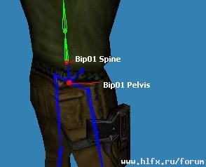 Bip01 Spine как обычно делит пополам тело, Bip01 Pelvis находится чуть ниже.