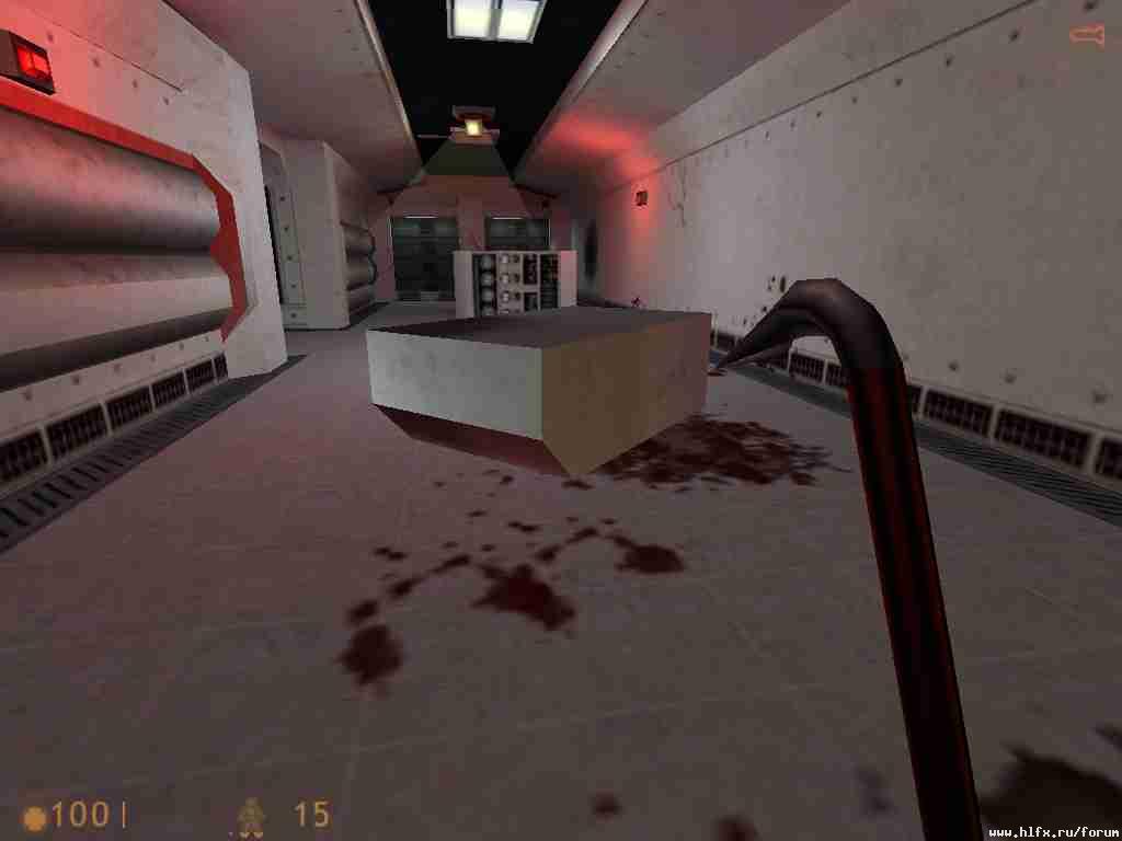Ну и ещё баг. Гибы (Gibs) вроде бы препятствуют движению брашей. Например, этот компьютер после взрыва не сразу упал. Тоже самое и с падающим лифтом, в котором были учёные. Он опускается вниз ("падает"), зависает на несколько секунд, и потом взрывается.