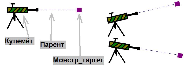 Очень просто. Берёшь создаёшь Кулемёт и аттачишь к нему какую-нить энтить с оригином, как показанно на рисунке. Я когда это делал юзал батон_таргет, но впринципе, наверное может ещё чё нить подойти. Например Монстр_таргет. Добавляем в Смарт эдит монстр_таргет пропертю health и любое значение. Далее добавляем кулемёту проперть firetarget и значение - имя монстр_таргет. Затем создаём Мультименеджер, в котором 2 раза указываем кулемёт с нужным интервалом. Ну чтобы он успел включиться, выстрелить 1 раз и выключиться. Ну и всё. При активации менеджера кулемёт стрельнет 1 раз и узбагоится. Активируй менеджер как заблагорассудится. Хоть КейКатчером.