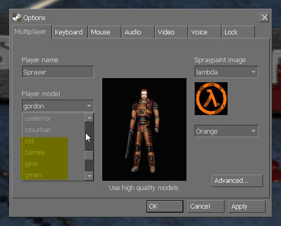 Take a note that the goal here is NOT to disable the player model selection; just to limit it to the content of the mod, that's why the "nomodels" value is set to 0, instead of 1...